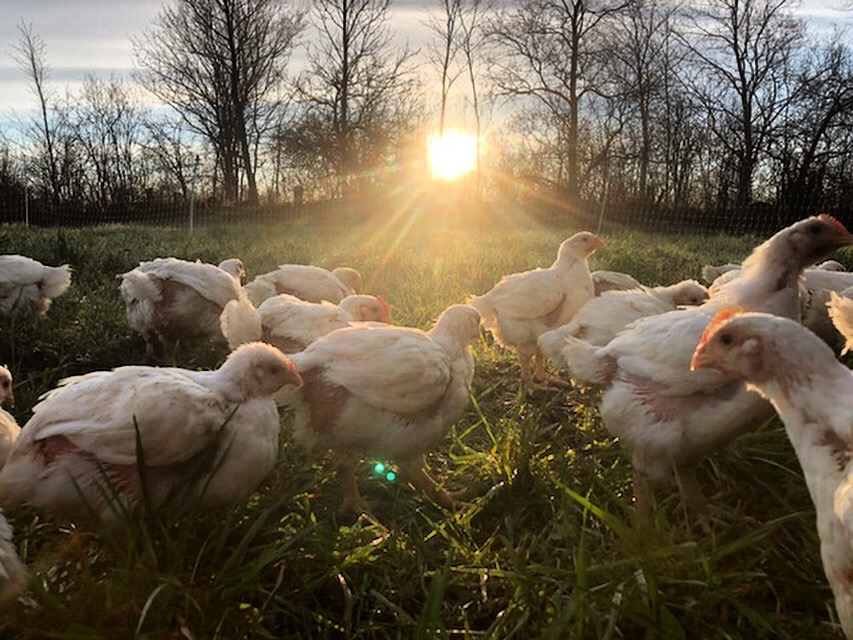 Our are chicken raised outside on pasture between May – October and are fed a certified organic diet. The chickens and their guardian animal, Cusco the llama, are rotated to fresh pasture regularly.