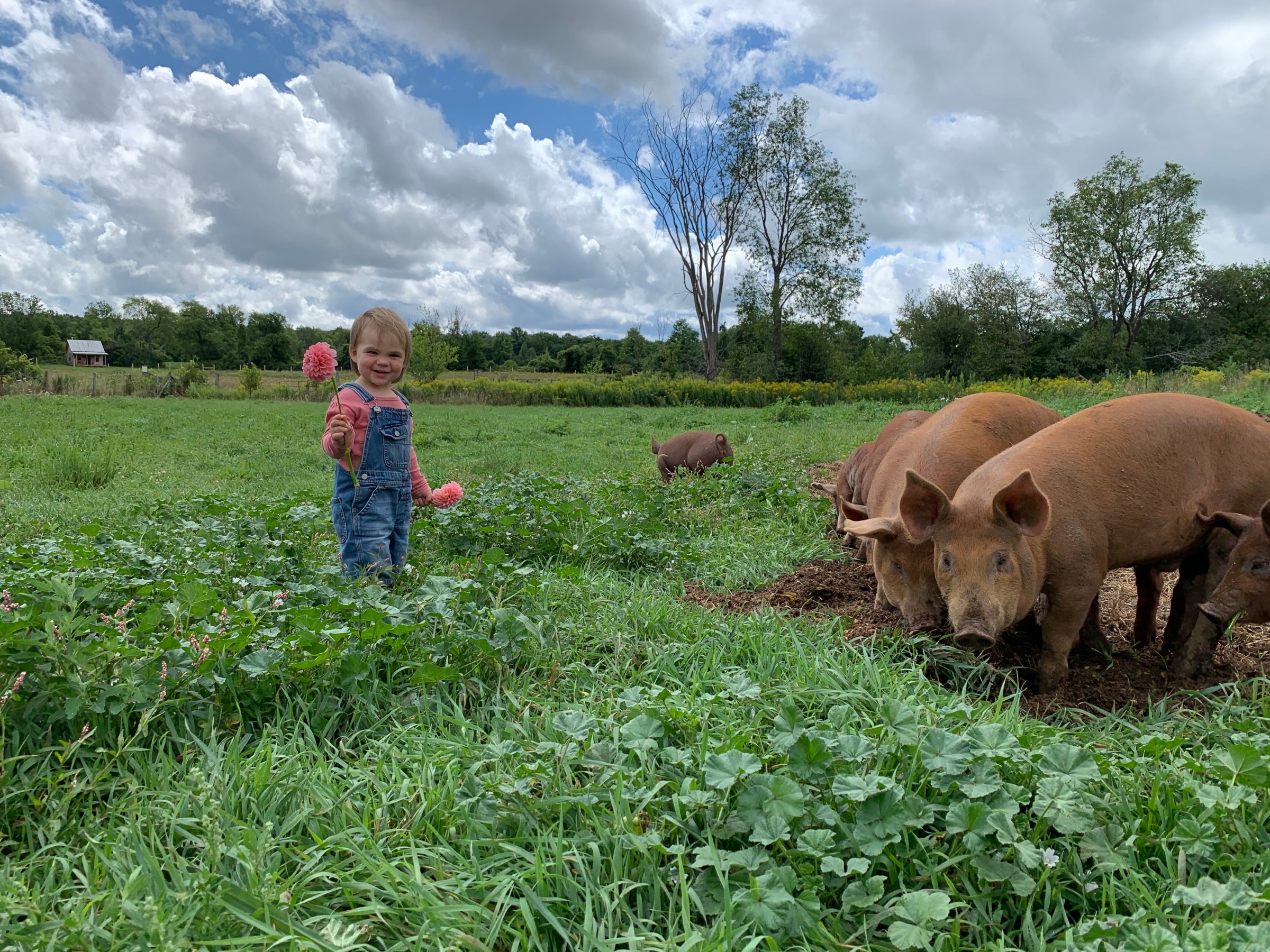 Our heritage breed pigs (Large Blacks and Tamworths) are raised outside, on pasture and are fed a certified organic diet.